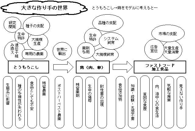 | 【第二版 まえがき】 「食の安全性」や「食育」が政治課題になるような現代は、どこかおかしいのではないかと思います。「食の安全」や「食のあり方」は、きわめて個人的な行為であるとともに、その人が暮らす地域や社会、歴史、自然によって決まることでもあります。 それをわざわざ誰かに「決められ」「言われ」なければならないのは、どこか変です。 では、どこがおかしいのか? ずっとそのことを考えていました。 昨年芸術選奨に選ばれた結城登美雄氏が、沖縄のおじい、おばあを調査したときの話を聞きました。 みな、必ず自分の屋敷畑を持っていて、それを一番大切なものとして挙げている。基本的に食べものは自分で作るか、隣同士、集落の中で譲り合って得ている。他者に「食べもの」を依存しておきながら「おいしくない」とか、「安全ではない」とかいうことは「みっともない」ことではないか? そんな話がありました。 今の多くの日本人は、他者に命を依存して生きています。どこから来たのか、誰がつくったのか分からないものを食べて生きています。そして、「安全性」に不安を持ち、「どこか間違っているのではないか」という不安やうしろめたさを持ちながら、生きています。 これは「みっともない」ことで、この「みっともなさ」を解消する必要があるのかも知れません。 政府は、輸入に依存している日本では、万が一輸入がストップしたら、きわめて厳しい状況になることを訴え、食料自給率の向上を政策課題に上げますが、その一方で、カロリー自給率とともに、金額ベースの自給率を指標にすることであたかも自給率が上がったかのような見せ方をしています。 これもまた「みっともない」ことかも知れません。 アメリカに言われて牛肉の輸入再開を急ぐあまり、専門家が「よくやった」と言う全頭検査態勢を崩そうとしています。日本は強く言えないからです。 世界中から食品を輸入しつつ、形の不揃いなもの、見た目の悪いものは容赦なく受け取らず、ちょっとブームになると一網打尽に輸入しておきながら、ブームが過ぎると輸入を止めてしまいます。そのことが、輸出国の生産者や自然環境をどれほど苦しめ、痛めつけているかを考えもしません。 ああ、これも「みっともない」ことです。 どうやったら、この「みっともなさ」を解消できるのでしょうか。 そのための考え方をまとめてみます。 第一版では、短く考えを整理することに徹しましたが、第二版ではあらためて考えを整理するため、長文となりました。 【第一章】 食べもののあたりまえすぎる大原則 人間がなにかを食べるということは、まずは、命を維持するためです。エネルギーとしての食べものです。 次に、身体を維持したり、成長するために必要です。物質としての食べものです。 さらに、次世代のために必要です。一番わかりやすいのが、女性の妊娠と出産後の授乳です。 だから、食べものには大きくふたつの原則があります。それはとてもあたりまえのことですがもっとも大切なことです。 【原則】 ・一年、一生を通して食べものが手にはいること ・食べて死なない、健康をそこねないこと 1)一年、一生を通して手にはいること 食べるものが1週間でもなくなると大変なことになります。1カ月手に入らなければ死ぬ人もたくさん出てくるでしょう。今食べものがなくて、3カ月後になれば届けられると言われても、その人には何の救いにもなりません。 食べものは、一年を通して必ず手にはいること、そして、一生を通して手に入れられることが必要です。 人間は、この解決として農業と食の保存技術を生み出しました。そして、たくさん生産でき、栄養豊富で保存ができるものを主な食べものに選んできました。 日本では「お米」がそれにあたります。収穫は年に1回ですが、栄養豊富で、保存できます。これを主食としています。かつては、雑穀、芋類なども主食の位置にありましたが、「お米」の生産性が上がり、生産量が増えるとともに「お米」が主食の位置に定着しました。 食料自給率が低いということは、いざというときに手元に食料がない可能性が高いということです。せめて7割ぐらいまでは自給しておかなければ、世界的な社会変動や異常気象があったときに、飢餓が起こる可能性もあります。 2)食べて死なない、健康をそこねないこと これもあたりまえのことです。食べると死んだり、食べて健康に悪いものは食べものではありません。重金属やカビ毒のような直接的に生命や健康に関わるものもありますが、食品添加物入りの加工食品や残留農薬のある野菜など、すぐには影響が出なくても、長期的に健康を害する可能性のあるものを忘れるわけにはいきません。 現在の自然環境は、水も空気も土も、以前とは違ってわずかであっても人工の毒物に汚染されています。農薬、重金属、ダイオキシンなど、人間が作り出した毒物です。 毒物を排出しない、作らないのがもっとも
