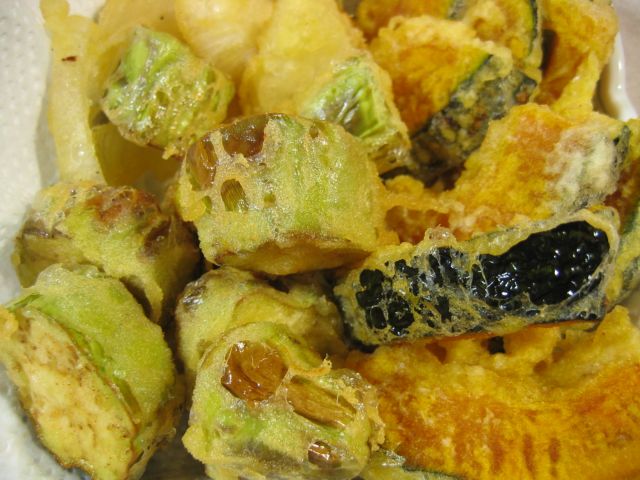 夜は、コロッケと天ぷら。コロッケは揚げなおしたもの。天ぷらは、オクラに包丁で切れ目を入れて丸ごと揚げる。かぼちゃと人参は普通に天ぷら。