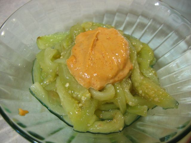 葛で表面をつるりと覆ったものに唐辛子ごまだれをのせた冷菓のようなおかずを水底がこしらえる。