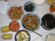 食:23時、ごはん、味噌汁、もつ野菜炒め、にがうりとトマトの卵炒り、ひゆな炒め、キムチ、なすの含め煮、納豆、とうもろこし。