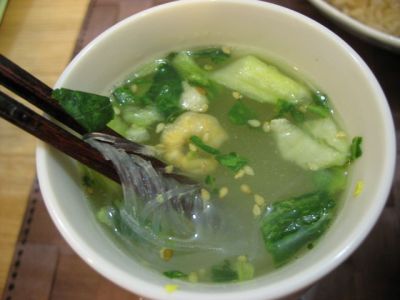 昼は自宅で、出がけに作った汁の最後の1杯。インスタントの太平燕(たいぴいえん)、水底のじゃこと梅干しまぶしおむすび。