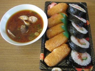 昼、あさり・ばか貝の味噌汁と助六弁当。