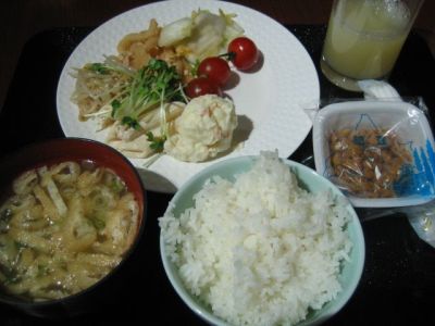 食:7時、ご飯、味噌汁、ポテトサラダ、マカロニサラダ、もやし炒め、切り干し大根、白菜漬け、トマト、納豆、ジュース、ヨーグルト、
