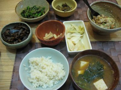 食:8時、ご飯、味噌汁、納豆、椎茸の甘煮、白菜漬け、ふき味噌、菜花のごま和え、はりはり漬け。
