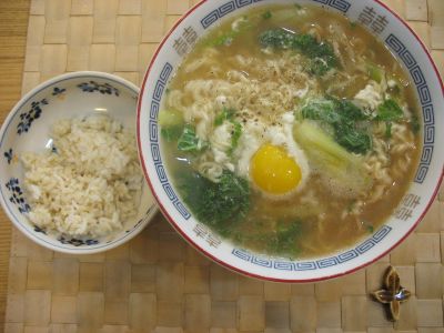 昼、水底不在。ひとりで、インスタント袋麺の金ちゃんラーメンに、野菜をあしらい、卵を落とす。