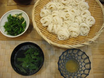 12:00 山芋そばとそうめんの合い盛り、なす・青じそ・みょうが・しょうがのつけつゆ、わかめ、お好み焼き、ちくわの甘辛煮、焼き油揚げ、ミニさつま揚げ、つけもの、ねぎ、しょうが、青じそ、野菜スープ