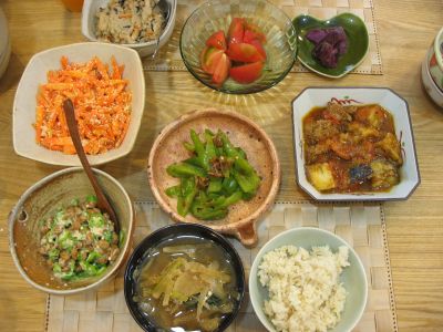 21:00 玄米ごはん、ごま鯖の煮付けオクラ添え、ポテトサラダ、庭の焼きなす、きゅうりとピーマンとトマトのごま酢和え、小松菜となめこと大根のみそ汁、にんじん明太、しば漬け、卯の花