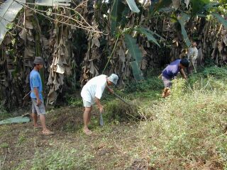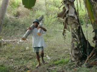 昨年は、植林をしていますが、今年は、まず苗作りです。まずは自生していたザボンのような大きな柑橘を食べ、種を取ります。また、マホガニーやイピルイピル(豆科の木)など見つけたら、種を確保しています。 育苗場の建築は、鈴木氏が書いているとおりですが、私も2日間、もっぱらカメラマンとして立ち会いました。 借りた敷地の草を払う。 斜面を重い木を2本も3本もかついで運ぶ。 堅い土に穴を掘り、杭を打つ。 豚や水牛が入り込まないように鉄条網を二重、三重に巻いては釘を打つ。 人が通れるように木のドアを立てる。 苗に強い日差しや強風が当たらないよう網のフードで囲いをつくる。 囲いの中に平らな面を作っていく。 雨が降ると流されるので、溝を掘る。 山の乾いた土と買ってきた有機たい肥を混ぜる。 プラスチックポットに土を入れる。種を入れる。 そして、水をかける。 山火事で、育苗場が燃えないよう、周囲に火入れをする。 2日間、第一号試験育苗場の完成です。 NGO・CORDEVのスタッフ、グレッグとジュリオス、それに、ジュリオスのお父さんはずっと参加し、あとは入れ替わり、立ち替わり人が参加します。 育苗場は、リトル・タジャンに最初に入植してきた人の敷地を借りています。しかも、井戸のすぐそばです。育苗場は水の確保が大事。水やりも大変です。育苗場の第一条件です。 2日目の夕方、土をプラスチックポッドに入れる作業をやっていると、カラバオ(水牛)に水を浴びさせようとやってきた少年が興味深そうに近づいてきて、じっと見ています。作業をしている大人達は知らんぷり。少年は、たまらず、鉄条網の内側に入り、やがて手伝いはじめました。 当の大人達は、全員が男性ということもあって、女性の話や冗談に花が咲きます。時々、グレッグが翻訳してくれましたが、きっと、あたりさわりのないものだけだったのでしょう。 日本でも、男性だけのとき、女性だけのとき、農作業や力作業をしていると、そういう話で盛り上がるものです。みんな疲れているようでしたが、笑いの力で最後まで楽しく作業を続けていました。 夜のひととき リトル・タジャンでの滞在は、ジュリオスの家でのホームスティです。以前にも紹介しましたが、ジュリオスのお父さんは、元鉱山労働者。入植後に、家族総出で半年以上かけてため池を手作業で掘り、それにより、カラバオの水遊び場、小さな田んぼ、ため池での魚の収穫、ため池周辺の木陰や果樹などを得て、自給することができるしくみを作っています。 もちろん、換金作物として飼料用のトウモロコシも作っていますが、まず、主食である米を自給し、魚などタンパク質も自分で確保して最低限の生活を築き、その上で子どもの学費などのために換金作物を育てたり、牛を飼っています。 この強い意志と現実の池や田んぼを見て、リトル・タジャンでのプロジェクトはスタートしました。 ジュリオス自身も、そのお父さんの元で、農業カレッジまで進み、そこで伴侶を得て、リトル・タジャンに戻り、CORDEVのスタッフとして各地を回りながらも、ふるさとであるリトル・タジャンを何とかしようと頑張っています。 陽が落ちてあたりが暗くなり、満天の星がまたたくころ、日本から持っていった日本酒を酌み交わしつつ、グレッグがジュリオスのお父さんの言葉を英訳してくれます。 「日本から友人が何度も訪ねてきてくれ、一緒に考え、働いてくれる。そして、長い夢だった木を植えて将来のために森をつくり、水の心配をなくすことが、少しずつ回りの理解を得て実現していく。このことに感謝したい」 一度、完全に伐採され、表土が流れるような山でため池を作り、安易に換金作物に走らず自給に軸を据えて生活を作るジュリオスの一家。その暮らしの姿勢を学ぶことができて、私もとても感謝しています。 ソラノの市場 今回は、帰路、時間を見つけてCORDEVの事務所があるソラノの市場を歩き回りました。ソラノは、北部ルソンの山岳部では一番の大きな市場だと言います。まさしく、巨大で迷路のような市場には、肉、魚、野菜、米、穀類、乾物、雑貨、衣料品、伝統薬などありとあらゆるものが揃っていました。もちろん、肉も魚も野菜も新鮮です。市場特有のにおいと活気に満ちています。人の姿も様々で、東南アジアの市場に必ずいる中国系の人、山岳の少数民族の人、ムスリムの衣装を着ている人など、雑多な人種、宗教、生活文化の人たちが、思い思いに買い物をしていました。特に大きな市が立つ日の午前中でしたから、市場の外の通りが延々とフリーマーケット状態になります。人と、トライシクル(自転車タクシー)、バイシクル(バイクタクシー)でぎっしりの路地の両側に、トマトだけを売る人、スイカを売る人、干し魚を売る人、野菜だけを売る人、手作りのお弁当やお菓子を売る人、鍋にぐつぐつと何かの生き物や根っこを煮て、その効能を叫んでいる人、ブリキの空き缶をリサイクルしてじょう