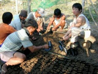 2003年3月、育苗場建設のためにリトル・タジャンを訪問した。 実質的な育苗場の建設は、3月5、6日の2日間にグレッグ、ジュリオスおよび建設用地の所有者であるハシントなど村民5名が参加して行われた。事前に提案しておいた簡単な設計図をもとに、外側10×7.5m、ベッド部分(ポット置き場)3×8mとすることとなった。 主な作業行程は、(1)建設用地の地上部刈り払い、(2)フェンスポストの設置、(3)バラ線張り、(4)ネットの設置、(5)ベッド部分のラベリングであり、これに加え播種作業として、ポットへの土壌充填、播種、ベッドへのポット設置、水やりといったところであった。この中で最も時間・労力を要した作業は、フェンスポストの設置であった。気温が約30度のなかで硬い土壌を50〜70cm掘り、重いポストを運搬・設置するのはなかなかの重労働であった。それでも6名+α(私たちも若干手伝った)の労働力で、全体の実質労働時間は、3月5日:午前中2時間、午後2時間、6日:午前中2時間、午後3時間、合計9時間であった。この他に建設準備として、フェンス・ポスト用の木材の切り出しに2時間・1名、ネットの縫合に1日・1名の労働を要したとのことであった。 育苗場建設に要する資材については事前に打ち合わせをしておいた通り、購入は最小限にとどめ、できるだけ現地で調達することができた。フェンスポストは現地のジミリーナ、イピルイピルを利用し、ポットはバナナの育苗場から無償で調達した。 今回の育苗場建設にかかった費用(2818ペソ)は予想以上に低く、投入労働力についても同様であった。それらに対する現地の人の感覚を聞き忘れたが、若干の労力の提供と初期費用でこのような育苗場が設置できることを現地の人が理解してくれたらと思う。今回は育苗場のベッドの1/3に、ポメロ(ザボン)を播種したポット約800個を設置した。発芽率など気になる点もあり、今後は樹種の選定、種子の採取を含め育苗場の維持・管理を追っていきたいと思う。次回はマンゴーの種子が手に入る6月に訪問する予定である。 |