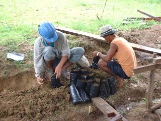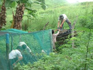 | 2003年6月、台風が到来している中リトル・タジャンを訪問した。以前に比べタジャンの道路事情は良くなってきているが、相変わらず雨が降ると所々ぬかるみ、今回も数回車が立ち往生し引き出すのに1時間以上かかった。 今回の滞在中、雨が降っていることが多かったがそれでも晴れ間をみて育苗場で作業を行った。育苗場全体に雑草が繁茂しており、バイオマスの豊富さに感心しつつまずはその除草作業を行った。今年3月に播種した柑橘の種子は、予想通り発芽率は低く20%程度であった。発芽したものは10〜15cmに成長していたが、防虫ネットを設置したにもかかわらずアゲハチョウの幼虫による食害に侵されているものが多く見られた。定期的に見回りをして、手で幼虫を取り除けばよいと思うがまだそこまでの意識はないようである。害虫対策としてニームを使ってみるようにジュリオスに提案した。ニームについての情報は多く見られるが、実際の効果を見るのに良い機会である。除草を終えた後、マンゴー、アボガド、ニーム、グアバノ、アカシア、ジミリーナ等を新たに播種した。これらの種子のほとんどは各人が採取や食後に保存したものであり、果樹の種子はプラスチック・ポットに、アカシア、ジミリーナ等の種子は発芽しやすく、害虫がつかないこともありネットの外にシード・ベットを作り播種した。人気のあるマンゴーは、数百個の種子が集まり用意したプラスチック・ポットが足りず、残りはやはりシード・ベットに植え、発芽後移植することにした。 育苗場の害虫対策、除草等の管理はまだ十分に行われておらず、自主的に行うようになるにはもう少し時間がかかると思われる。このプロジェクトに最も理解を示し、育苗の技術も持っているジュリオスが仕事の関係上、村を離れていることが多いのは残念なことである。しかし種子を集めることに関心を持つようになったことなど多少変化が現れてきている。またこれまでこのプロジェクトにあまり関心を示さず、積極的に係わってこなかったサイモン(ジュリオスの長兄)が今回熱心に手伝ってくれ、個人で育苗するためにプラスチック・ポットを持ち帰っていた。後で訪ねてみたところ、自宅の庭に小さな育苗場を作り、ジュリオスに柑橘の接ぎ木の仕方にを習っている姿が見られた。 このように少しずつではあるが、村民の育苗や植林に対する意識は変わってきているように思われた。 今後も育苗場を発展させつつ、村民の関心を高めていきたいと思う。