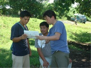 日本中どこへ行くにも、地図を片手に、釣りをしたり、集落調査の仕事に出たりと、地図に書き込まれたさまざまな情報を活用して、ポイントや地域資源を確認しながら僕は旅を楽しんでいます。ところが先日、フィリピンの集落調査に同行したときは、自分のいる場所の標高も河川の状況も、それぞれの位置関係や距離もわからず途方にくれてしまいました。もちろん、そこで暮らす人々は、自分の経験則で暮らしているのでなんら困った様子は見られません。 「井戸を掘ってポンプアップできないかな?」 などの協議が行われると、標高差と距離、等高線の状況などがまったくわからないことに気づきます。どこのルートを通せば良いか。発電量やポンプの性能、配管の長さはどうか…。こんな話が出て、簡単な水位と集落間の距離や方向程度がわかる地図を、おこすことになりました。幸い方位計と標高計がついている時計を持参していたので、極力丹念に基点となりうる山の頂や飲料水のタンクの場所、学校の屋根等に合わせて計測してみました。 調べてみたのは、2つの集落と1つの農場。この3つの位置関係は、どのようになっているのかです。地元の方に尋ねてみると、あの山の3倍先に次の集落はあるとか、歩くと、2時間ほどだとか、この辺で一番高いのは、EMIKO岳だというような返事が帰ってきました。また、どの井戸が良いか悪いかと聞くと、乾季に枯れないのは一つだけという返事も帰ってきました。この2の集落の飲料水は、標高の高いところにある浅井戸でした。井戸が遠い家は、雨水を溜めて煮沸して飲んでました。 地図をつくりながら、安定的な井戸の位置、簡易な水の管理方法、樹木や作物を植えるべき位置などが、山と谷、湧き水と井戸と池の位置から、少しづつ見えてきます。この地図を元に、地元の方々が、必要な情報を書き入れ、方位や距離を細かに計り直して修正していけば、なんとか、集落の今後を話し合うための地図ができて、計画づくりの参考になるのではないかと期待しています。