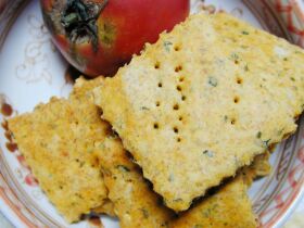 | 材料(20〜25枚分) 薄力粉…50g 全粒粉…50g ベーキングパウダー…小さじ1 バター(無塩)…20g 粉チーズ…10g ビール酵母(粉末)…10g トマトジュース(無塩)…大さじ4 水…大さじ2 乾燥パセリ…大さじ1 |