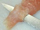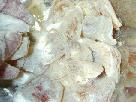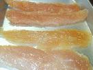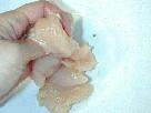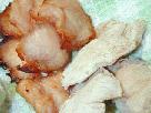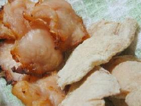(1)手をよく洗って準備する。ささみは筋ありなしどちらでも構いません。 ![]() (2)しょうがをすりおろしてささみを入れたボウルに加える。 ![]() (3)はちみつを加える。 ![]() (4)ささみにしょうがとはちみつをよくもみこむ。 ![]() (5)ピチットシートを1枚敷き、ささみを並べて ![]() (6)きっちり包みこむ。 ![]() (7)包んだシートごとささみをジップロック(密閉ビニール袋)に入れ、冷蔵庫に入れる。1日経ったらシートを取り替えて包み直し、ジップロックに戻してもう1日冷蔵庫で脱水する。 ![]() (8)2日間脱水したささみを、シートをはがして取り出す。 ![]() (9)水分が抜けてあめ色になっている。 ![]() (10)よく切れるナイフでささみをそぎ切りにする。 ![]() (11)半量にビール酵母パウダーをまぶす。※ビール酵母バージョンはお好みで。 ![]() (12)よくもみこんで表面にまんべんなくまぶす。(すりごまなどをまぶしてもおいしいです。) ![]() (13)天板にオーブンシートを敷き、肉を平たく並べる。 ![]() (14)100度にあたためておいたオーブンで45〜60分乾燥焼きする。低温設定のないオーブンの場合、一番低い温度で様子を見ながら焼く。 ![]() (15)むちむちと弾力が出て端がカリカリと乾いて色づいたらできあがり。(ビール酵母バージョンは色づかないので乾燥具合で判断)冷めたら密閉袋に入れて冷蔵庫の野菜室などで保管する。季節にもよるが、1週間程度で食べきる。それ以上保存する場合は冷凍庫へ。 ![]() (16)オーブンの温度と時間の指定は、ガスのコンベクションオーブンの場合の設定です。電気式のオーブンなどの場合、様子を見つつ、途中スイッチを切ったり時間を長くするなど調節して様子を見ながら作ってください。 メモ: つけ込みのときにたまり醤油を小さじ1〜2加えて揉み込んでつくると、醤油の甘味やうまみが加わったおつまみになります。スパイスやハーブも合うはず。ペットのおやつの場合には塩分量や刺激物に気を付けてアレンジしてみてください。 ちなみに、たまり醤油+しょうが+はちみつ+ごま油で下味つけて脱水+乾燥焼きしたささみジャーキーは、私のヒトオヤツです。うまいんだこれが。 脱水シートできっちり肉の水分を抜いてうまみを濃縮し、日持ちをよくします。 ■ピチットシート 脱水シートです。ピチットスーパーだと、ラップやホイル、ジップロックなどのコーナーにあると思います。結構割高なので、私は合羽橋で業務用の割安なものを買って使っています。(「業務用 ピチット」で検索すると通販してるところも出てくるはず) 脱水シートを使うと、ひと塩した魚を包めば干物になり、お肉のおまみも凝縮できてなかなか便利なものです。 秋冬で乾燥し、風のある日であれば、干物かごに入れて陰干ししても作れます。 塩分を添加していないので衛生面には十分気を付けて作業してください。 |