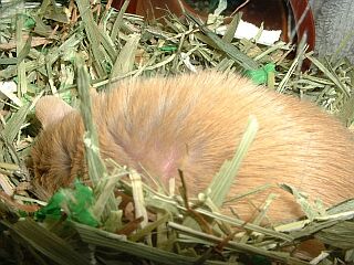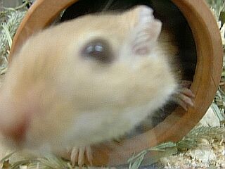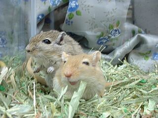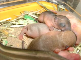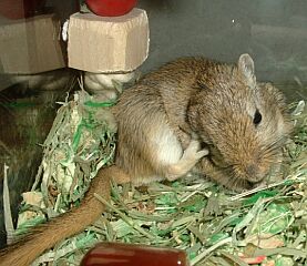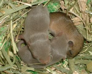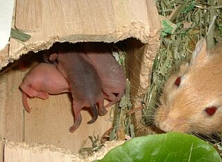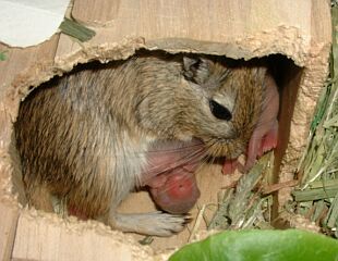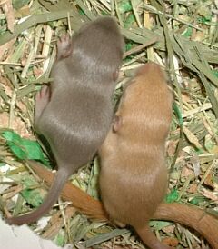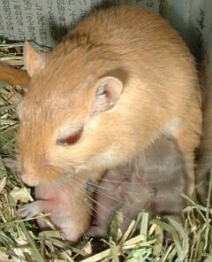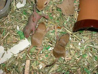 むぎがくたびれている。 そりゃ、6匹もの赤子たちに、血と同じ乳をちうちうと吸われ続けたら、疲れもしよう。 心なしか目の回りにクマができ、頬がこけてみえる。 ペットミルクをペースト状に練り、パチンコ玉くらいのボールに丸めたものを渡すと、一心不乱にむさぼり食う。 まめがふんふんとじゃまをするので、やせたかぼちゃの種でごまかしつつ、むぎちゃんに召し上がっていただくのだ。 このボールを1日に3回あげたが、3回とも素早く平らげた。 消化が良く、すぐ乳になるのであろう。 明日からもこの乳玉を潤沢に与えて滋養をとってもらうことにする。 ちなみに、まめは乳玉を食べた後のむぎの口の周りをぺろぺろとなめるのが好きだ。 甘くておいしいのだな。 むぎがくたびれる理由はもうひとつある。 砂場ほりほりと木箱かじかじを、今まで以上に一生懸命、一日中やるからだ。 「ああ、いそがしいいそがしい」「これもやんなきゃあれもこれも」 とがんばっている。お乳やり以外は、だらだらしていればいいのに。 苦労性なのだろうか。 赤子たちは元気にうごめいている。 ちょびっと成長してきたようだ。ちょびっとつまんだくらいだった耳も、色づいて頭から離れてきた。 どうやら、ノーマル茶色の子が2匹いる。あとはベージュらしい。 小さいくせに、しっぽがいっちょまえに1cmくらいの長さあって、ふりふりと動かしている。 なんとなく表皮が毛っぽくなってきたような気もする。 まめは、ぎこちないながらもコドモちゃんたちのお世話をしていてほほえましい。 まめにお乳はないが(いや、あっても出ないが)、横たわって「お乳やりポーズ」をしてコドモをあたためている。 コドモがかわいくてしようがない、パパの図。 でも、パパもかわいいのですよ。 ムーシュは、なんだか袖口の当たりに筋肉が付いてきて、ラグランスリーブ度がアップしている。砂を手でほりほりして鍛えているのだ。ブルワーカー。 「ひ弱でもてなかったボクですが、ブルワーカーでこんなにムキムキ・モテモテに!」 がんばるがいい。