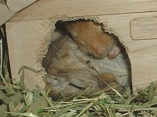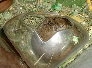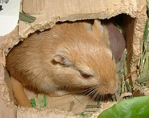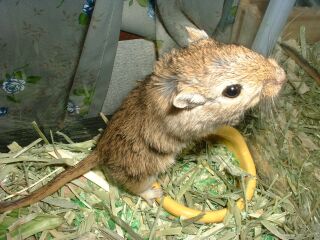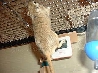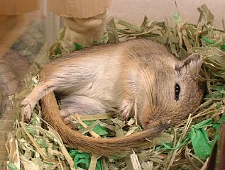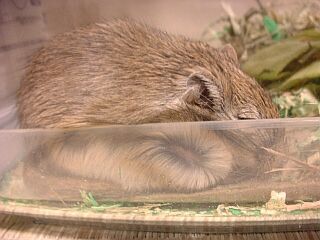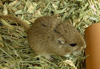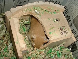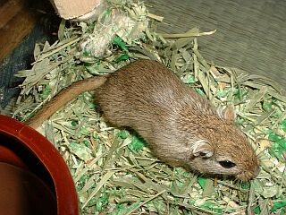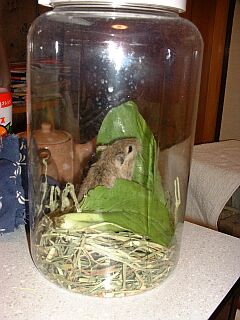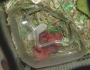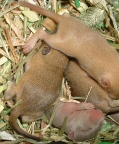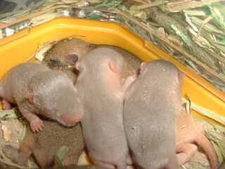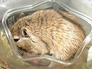 夫婦で育児疲れ。 コドモたちはさらに成長を続けている。 そろそろ、表面にびろうどのような細い毛が生えてきて、光が当たるときらきらする。 とれたてのトマトみたいな感じ。 目の所に、まぶたの線がくっきりできてきた。 コドモなのに、大っきな目。さすがスナネズミ。 6匹のコドモたちがみんなでじゅうじゅうとお乳を吸うので、むぎの疲労もピークに達しようとしている。 なんだかうつろな目で放心しながら吸われている感じ。 最初の頃は、むぎが普通に座っているだけでコドモたちの姿が見えないほど小さく、おなかの下に収まっていたのだが、今はむぎが浮いている。 体力の消耗も激しいらしく、授乳の後に巣の外にぐってりとナマコのようにねそべっていることが多い。 とりあえず、「乳玉」を手渡すと、うつろな目のままむしゃむしゃと食べ、また戦場に戻って行くのだ。 乳玉は、ポンジュース(オレンジ)で溶いている。水で溶いたものより食いつきがいいようだ。 むぎが食事をしたりかじかじをしたりしに出かけるときは、必ずまめが巣の中で番をしている。ケナゲ。 おとうちゃんだとはわからないのか、コドモたちがお乳を探してわしわしとまめの毛をかき回すので、まめはいつもボサボサの毛並み。 しかし、この「ナイト」は、巣の中でかなり熟睡してしまうので、むぎママがお乳をやりに帰ってきても、そこをどかないで寝入っていることがある。ぐー。 仕方なく、むぎがむりむりと中に入り込み、まめの上にアーチ状に姿勢をととのえると、まめの下からコドモたちがむじむじと這い出してきて、むぎの下に潜り込んで乳を吸う。 ねずみサンド。 ムーシュは今日もひとりでそうめんの箱をかじっている。 最近よく触っているので少し触られ慣れた模様。 ごほうびのひまわりが目当てで、愛想良くなることを夢見る。 いつも浴び砂を買っている駅ビルのペットショップで、小鳥の焼き砂を注文した。 いつものは、マルカンの「浴びっこサンド」というもので、600g\240也。 けっこう使うので、安い方がよい。 小鳥用のものだと、2kg入りで安いのがあると聞いたので調べてもらったら、\350であるという。3袋注文した。 来週の水曜日には届くというので取りに行かねば。 ねずみたちも気に入ってくれるとよいが。