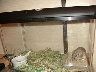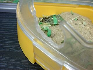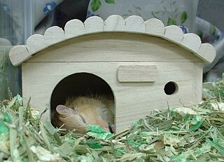 むぎちゃんご懐妊ほぼ確定。 ひと晩でずいぶん腹がふくれた。どういう仕組みになっているのだ。 ちょっと歩くのが大儀そうだが、完全に目を覚ますと元気に走り回るむぎ。 煮干しやミルワームで栄養を付けてもらう。 関係ないまめも栄養をとる。複数飼いだと、1匹だけひいきするのがむつかしい。 「どうせかじっちゃうんだから、外で巣を作って寝ればいいや」と、粉砕された巣箱一号のあとはアウトドアライフをねずみたちに強いていたのだが、むぎがコドモを産むのに産室があった方がよかろうと、巣箱第二号を購入してきた。 今度のは屋根がログハウスっぽく、アーチを描いている。 前のものより少しサイズが小さく(ねずみが育ったというのもあるが)、2匹入るときつきつ。むぎのために入れたのに、まめが気に入って早速出入りしている。 しかし、「木でできた暗く狭い場所」というのはねずみの寝床に適した環境らしく、しばらくすると2匹とも中ですやすや寝ていた。 子ねずみたちがある程度育つまで、この小屋は形を保っているだろうか。 もう入り口ちょっとかじってるし。 かじると言えば、ムーシュがさらにトイレの入り口をかじるのだ。 大概にしていただきたい。 プラスチックの粉を少しは食っているだろう。 入り口がガギザギになって、出入りするときに痛かろうに。愚かなねずみめ。 今日は夕方、プランターのバジルの摘心をしたので、その葉を数枚ずつねずみたちに分ける。 かなり香りが強いが、よほど気に入ったのかすごい勢いで食べてしまった。 特にムーシュは、茎をくわえて振り回したり、後脚でケトバしたりしながら興奮してむさぼり食う。 ジェノベーゼ・ハイ。 ---------- 昼過ぎに外出し、新宿で昼食。 新宿駅ビル地下の台湾小皿料理店Tで定食をたべる。 ここはおかずの種類が豊富で、ごはんによく合うものが多い。スープ代わりについてくるミニ担々麺もうれしいものだ。 デザートにはつるるんとしたさっぱり味のゼリーが付く。 となりのタイ屋台料理の店Gも、開店当初は閑古鳥だったが、若者でにぎわっている。 ファンとしては嬉しい反面、混み合っていてなかなか入れなくなったのはくやしいものだ。 カブトムシゼリーがなくなったのでまた作る。 配合は以下の通り。 ・粉末寒天5g ・水250cc ・メイプルシロップ大さじ5 ・はちみつ大さじ3 ・黒砂糖50g ・ミタニ昆虫ビタシロップ1本 水に粉末寒天を溶いて弱火にかけ、黒砂糖を入れてかたまりをつぶしながら溶かす。 沸騰したら火を止め、メープルシロップ・はちみつ・ビタシロップを入れて型に流し、冷蔵庫で冷やし固める。 昆虫ゼリー容器で20個強できる。 型は昆虫ゼリーの空いたのを利用しているが、製氷皿でもいい。 固まったらまとめてジップロックなどの密閉袋に入れ、冷蔵庫で保存する。 めんどうなら大きい容器に固めて、スプーンで適当にくずして与えてもいいだろう。 市販の昆虫ゼリーと比べて食いつきに遜色はない。 手作りは面倒だと思う方は市販のものを利用した方がいいだろう。 私は山の上に住んでいるので、買いに出る方が面倒なのだ。 ■□■□今日のF.F.7■□■□ 今日は外出していたのでやってません。 早くカエルとあそびたいと思います。