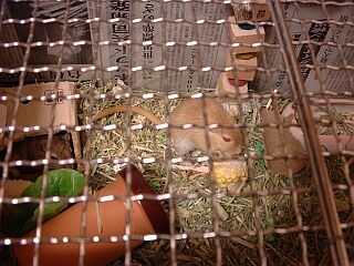 2000.7.29(SAT) 最高気温:28℃ 最低気温:24℃ 湿度:65% 天候:はれ ねずみごはん: (共通・1匹あたり)ニッパイハード1個、ハトのえさ小さじ2分の1、小松菜2枚、 サンチュ1枚、ビオフェルミン1かけ、かぼちゃの種1粒 (まめ)かぼちゃの種2粒 (むぎ)乳玉2個、かぼちゃの種1粒、乾燥パイン1粒、フルーツチップ1かけ (ムーシュ)ひまわりの種1粒、乾燥パイン1粒 わたしごはん:冷やし中華、ゴーヤチャンプルー、チャーハン、挽き肉カレー など | ||||